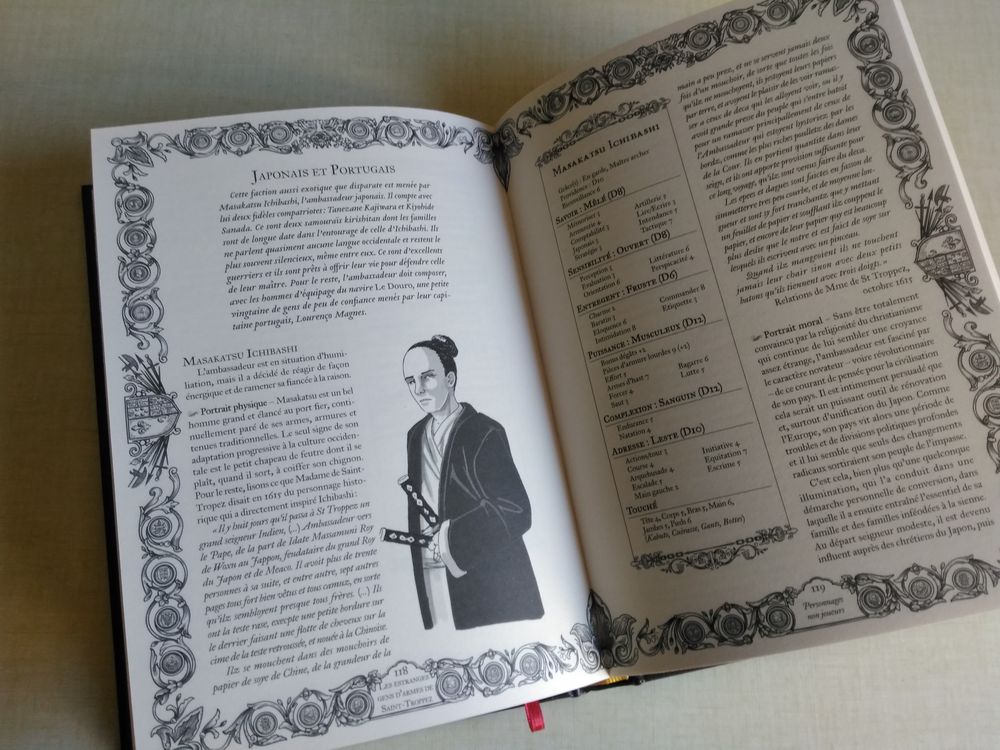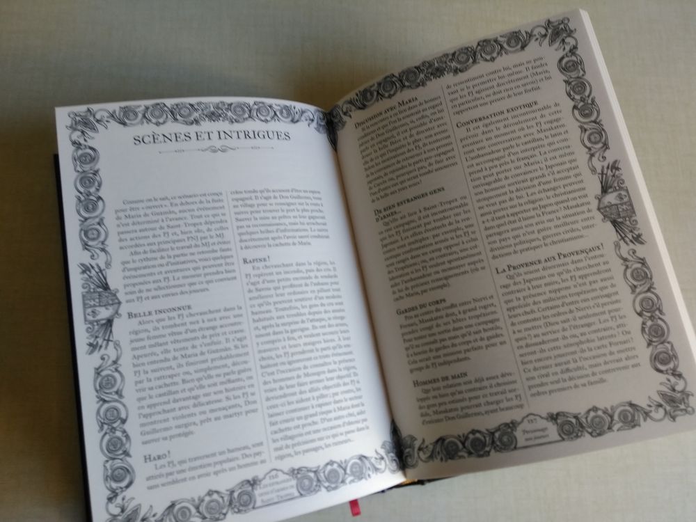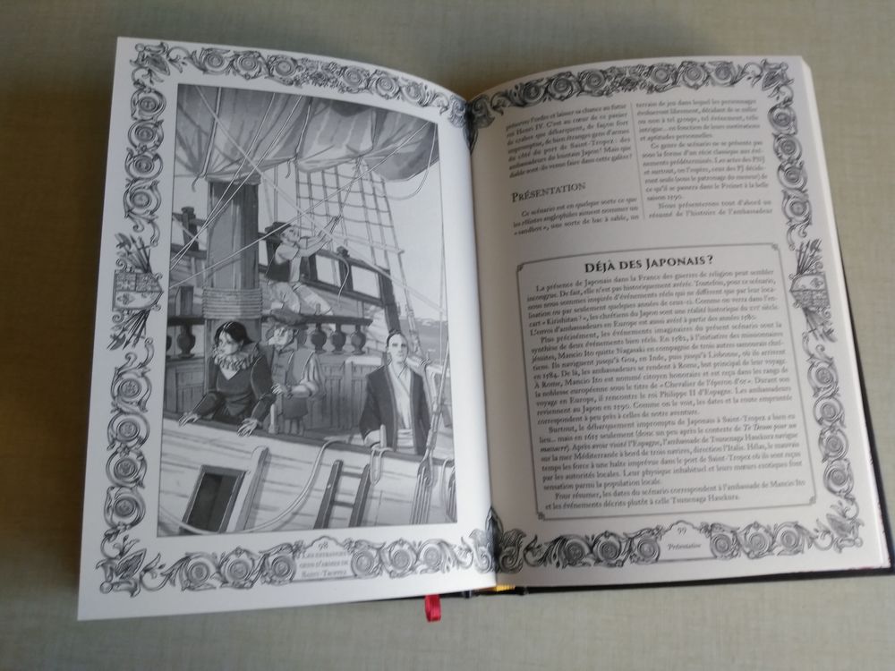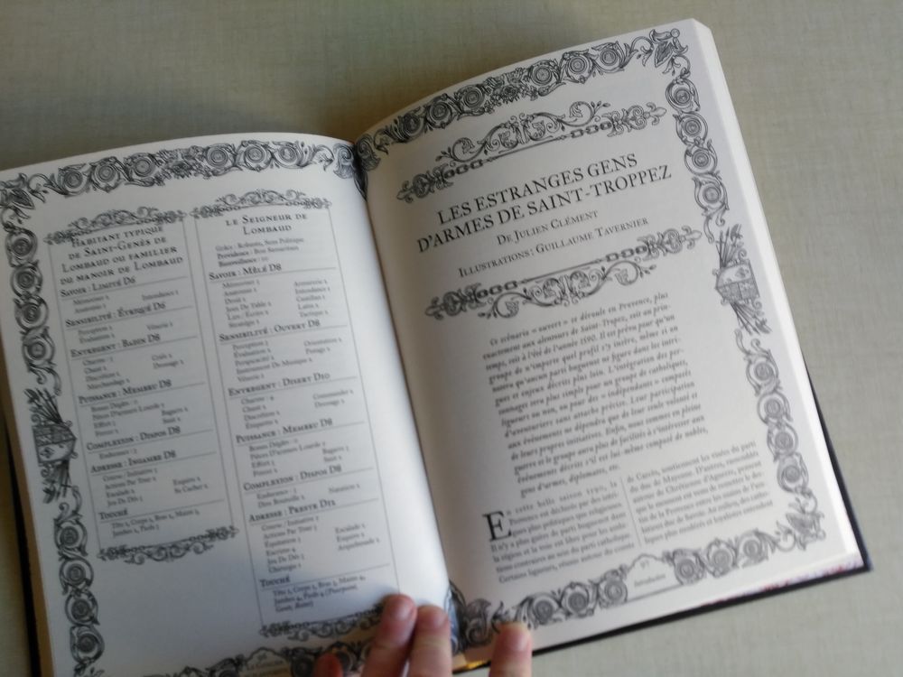 J’ai eu le bonheur de découvrir le fait que mon scénario y était illustré par le talentueux Guillaume Tavernier, plus connu pour les multiples plans et paysages illustrés des jeux de De Architecturart (et de mille autres projets). Comme on le voit, c’est une édition assez cossue avec du beau papier, des illus nombreuses et une couvrante qui évoque les incunables d’autrefois. Cela valait le coup de participer !